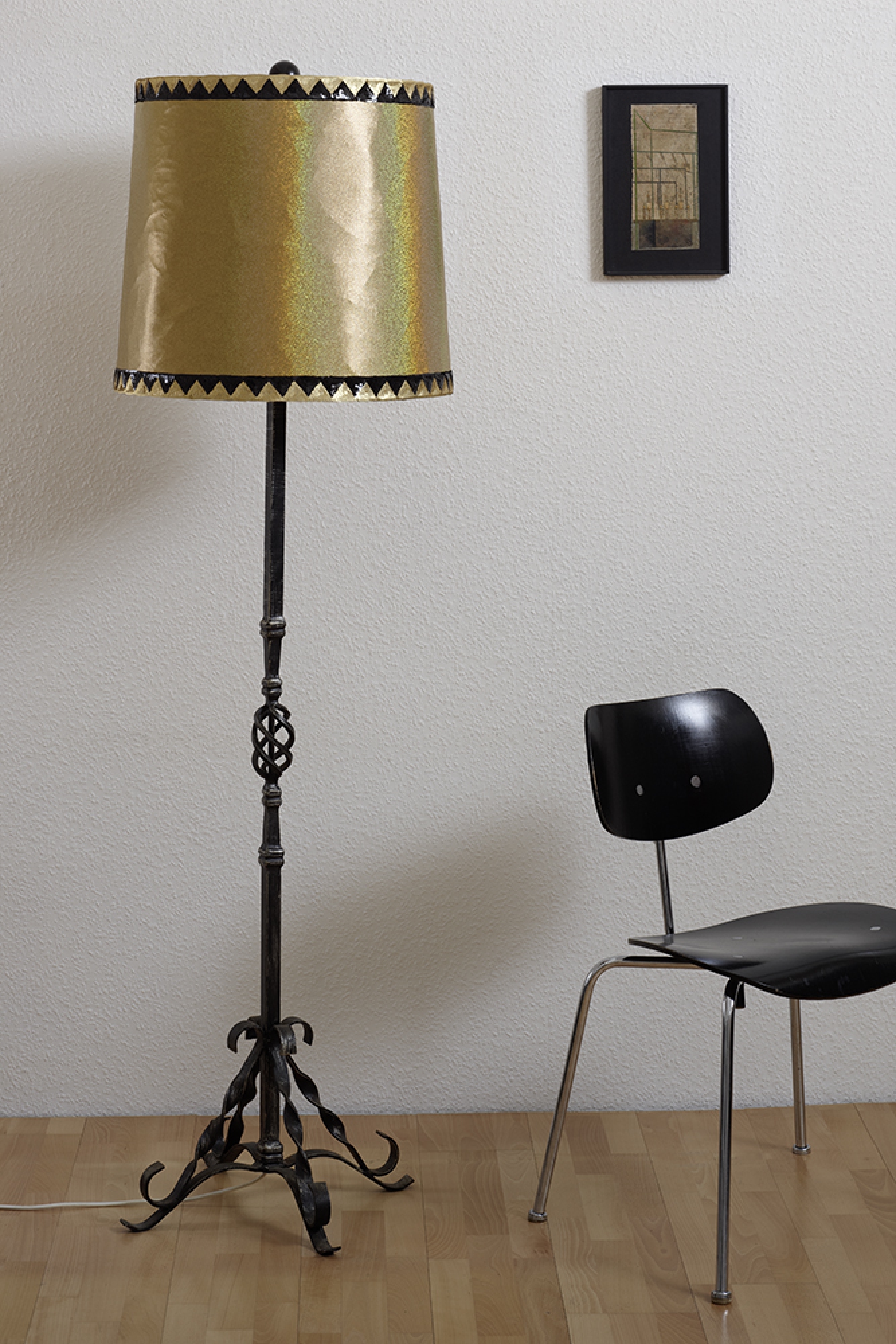 Material: Stoff, Lampenschirm, Bordüre, Fasermalfarbe, Papier, schmiedeeiserner Ständer